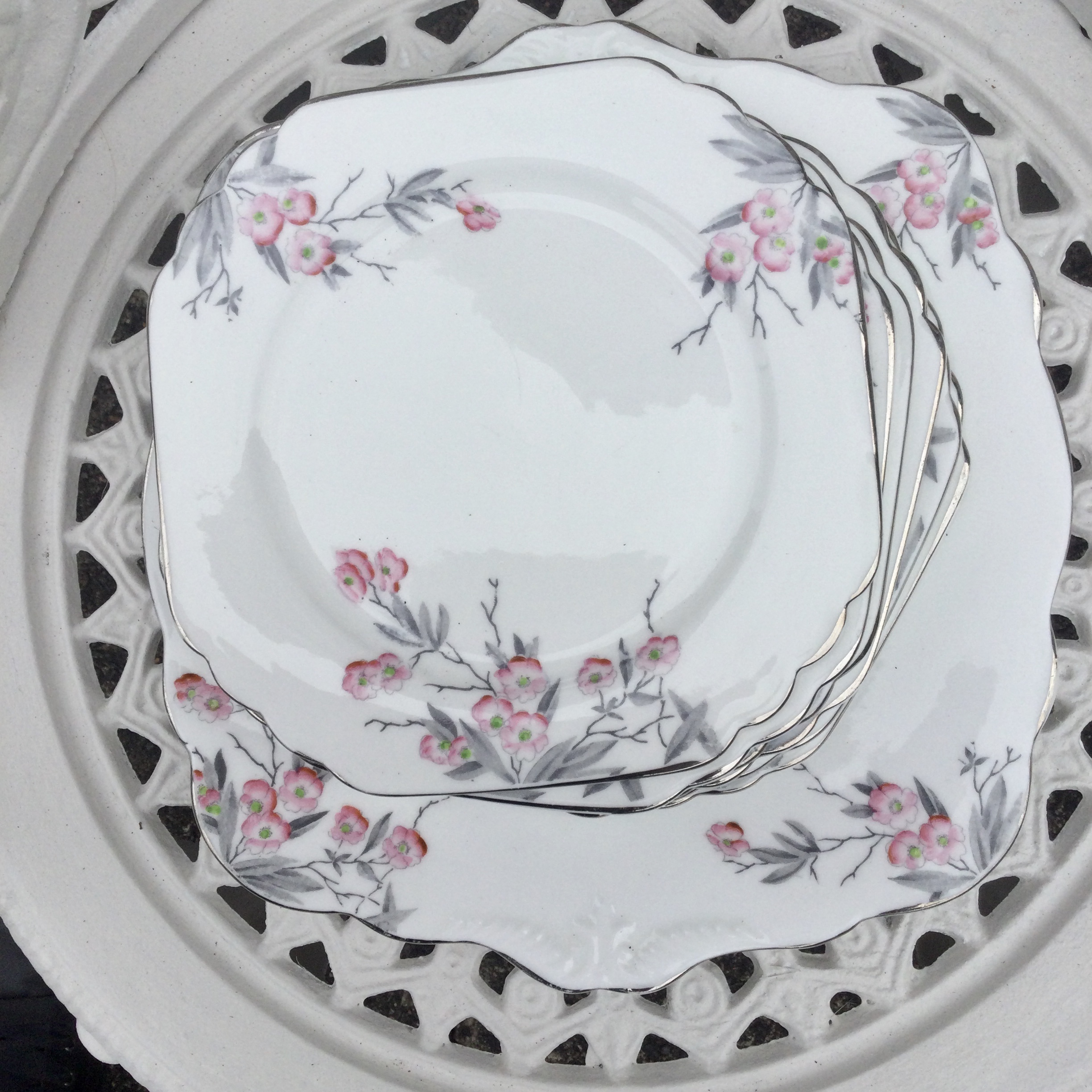 7 pieces in lovely shiny condition. No chips or cracks or crazing. Very pretty pink blossom design on white.